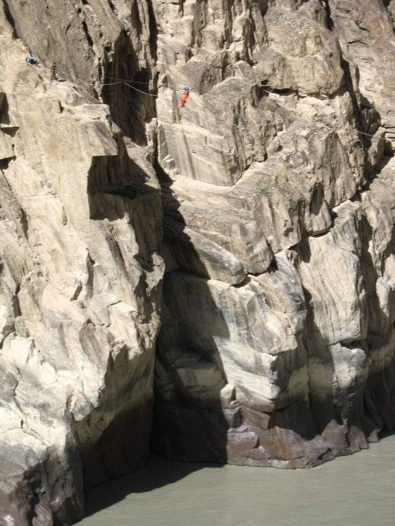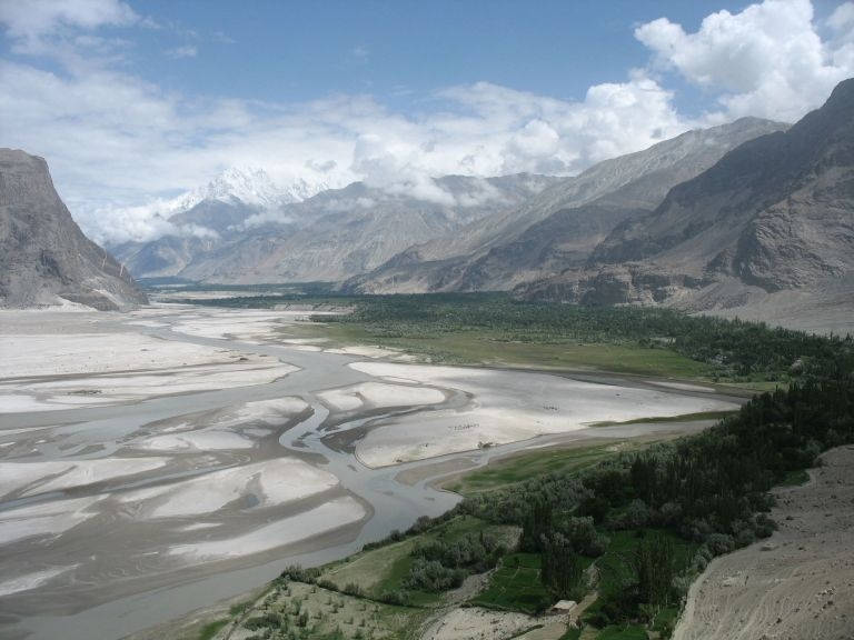 Surrounded by 6-7000m mountains the road follows the Indus river. Sheer cliff faces and villages only accessible by flying fox make this trip interesting. You will meet some trucks, but for once the drivers are courteous. Near Skardu the river becomes very wide and the bed consists of blindingly white sand dunes.